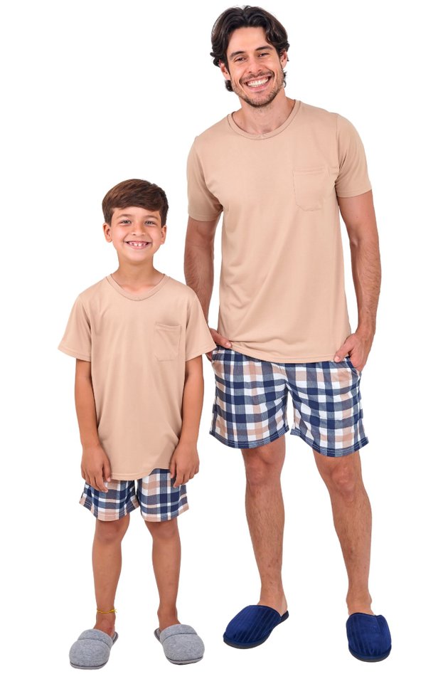 O Kit Pai e Filho da Coleção Xadrez Elegance é a definição de bom gosto para o homewear masculino. Combinando a suavidade do bege fendi com a elegância do xadrez em tons de azul marinho, este conjunto "Tal Pai, Tal Filho" oferece um visual coordenado e discreto, perfeito para relaxar com qualidade e sofisticação.
