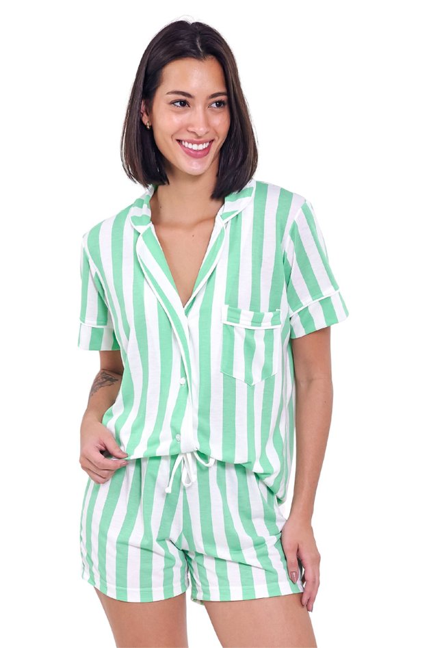 O Pijama Americano da Coleção Aroma de Hortelã é a escolha perfeita para quem não abre mão da sofisticação até na hora de dormir. Com um design atemporal listrado e o toque geladinho da malha fria, ele oferece o equilíbrio ideal entre conforto e beleza. 🍃