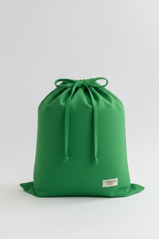 Saquinho feito de malha na cor verde, com cordão (amarril).